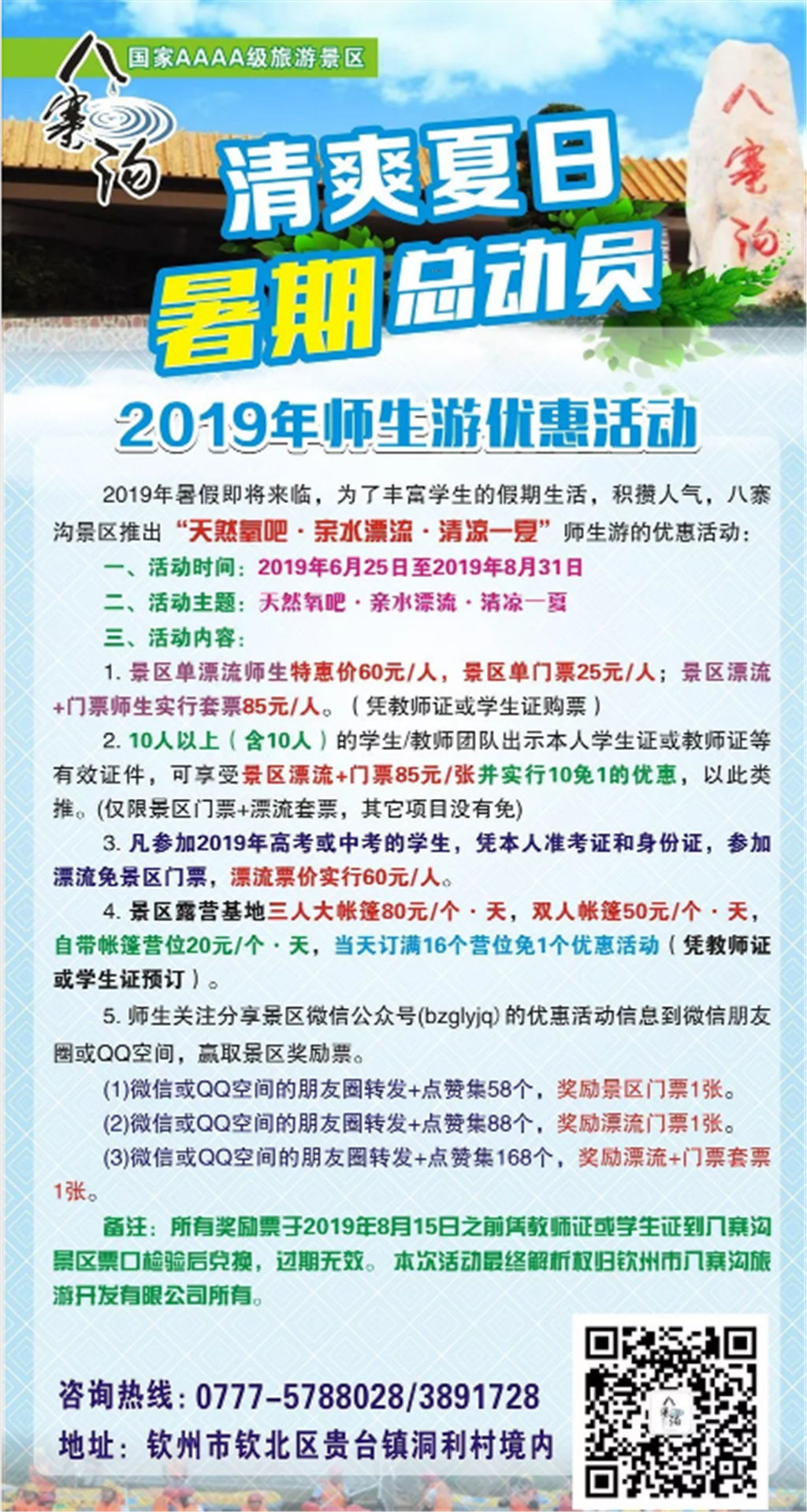 2019 年暑期將至,八寨溝景區(qū)推出暑期系列票價優(yōu)惠政策, 師生群體可享受景區(qū)門票半價, 八寨溝森林漂流特惠價, 關注景區(qū)微信公眾號并轉(zhuǎn)發(fā)朋友圈集贊, 贏取八寨溝景區(qū)門 票和森林漂流票等系列優(yōu)惠活動。