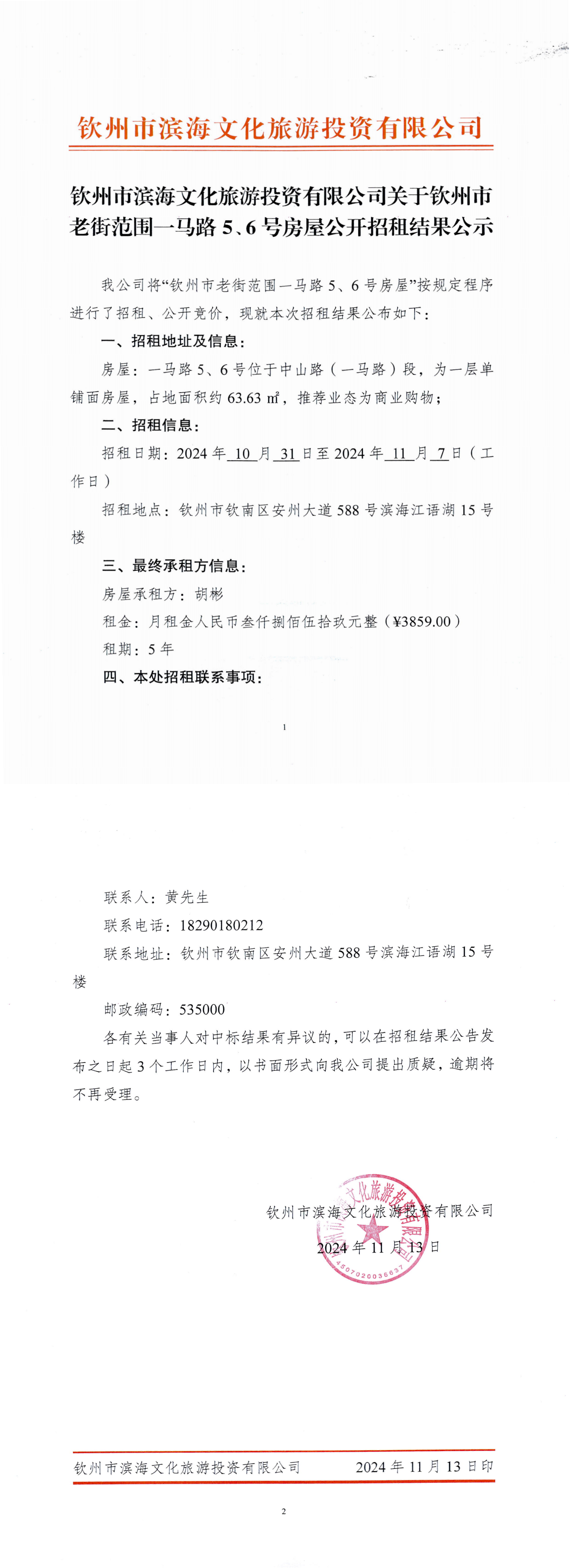 欽州市濱海文化旅游投資有限公司關(guān)于欽州市老街范圍一馬路5、6號(hào)房屋公開(kāi)招租結(jié)果公示