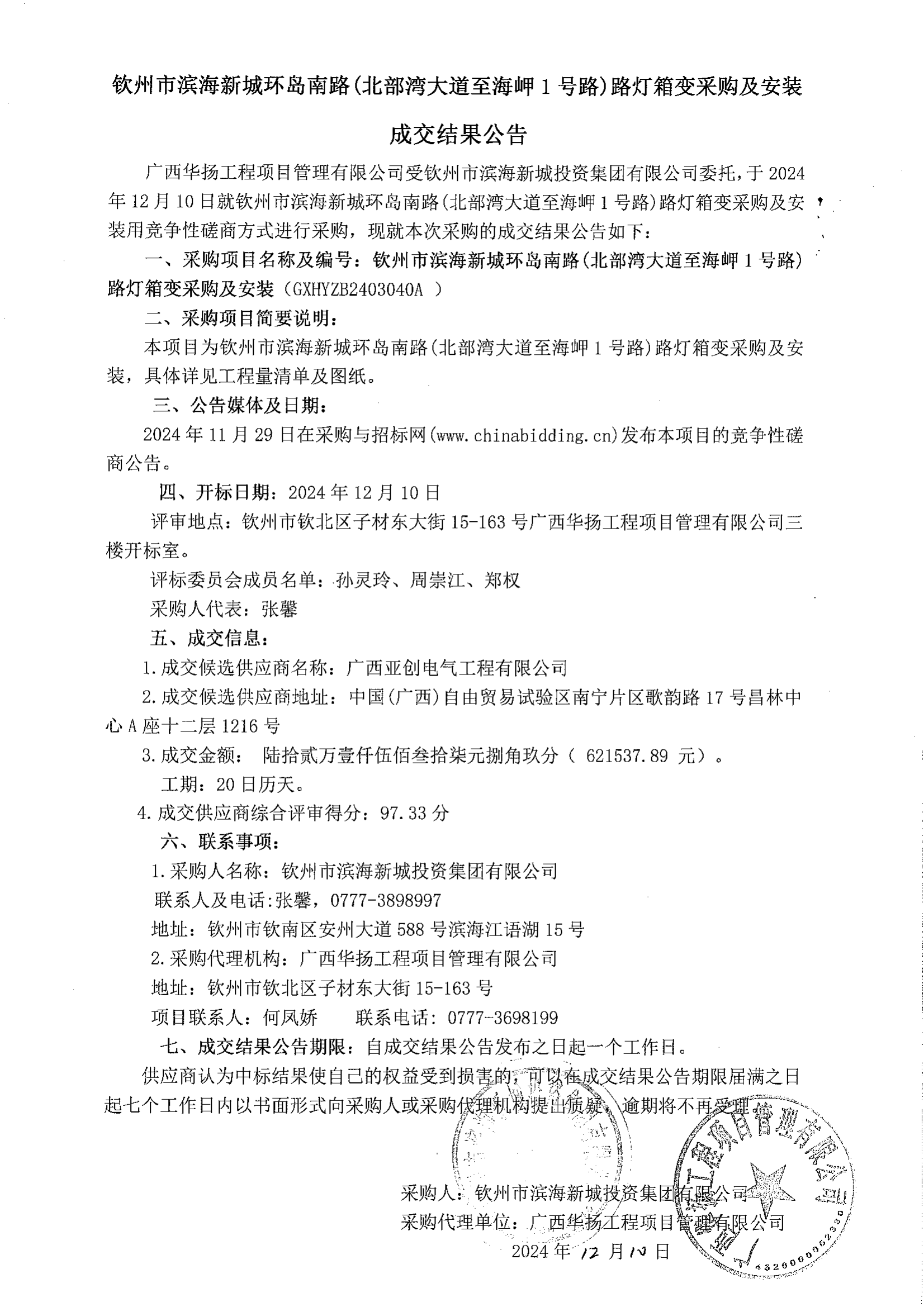 欽州市濱海新城環(huán)島南路(北部灣大道至海岬1號(hào)路)路燈箱變采購(gòu)及安裝成交結(jié)果公告