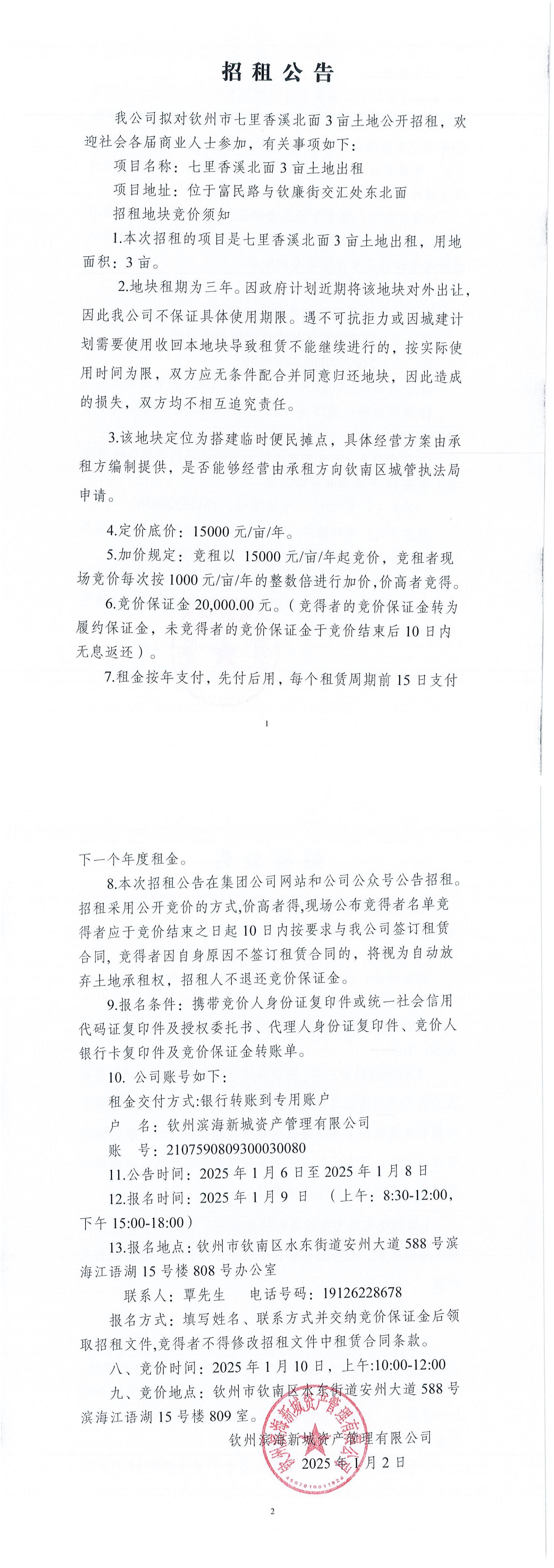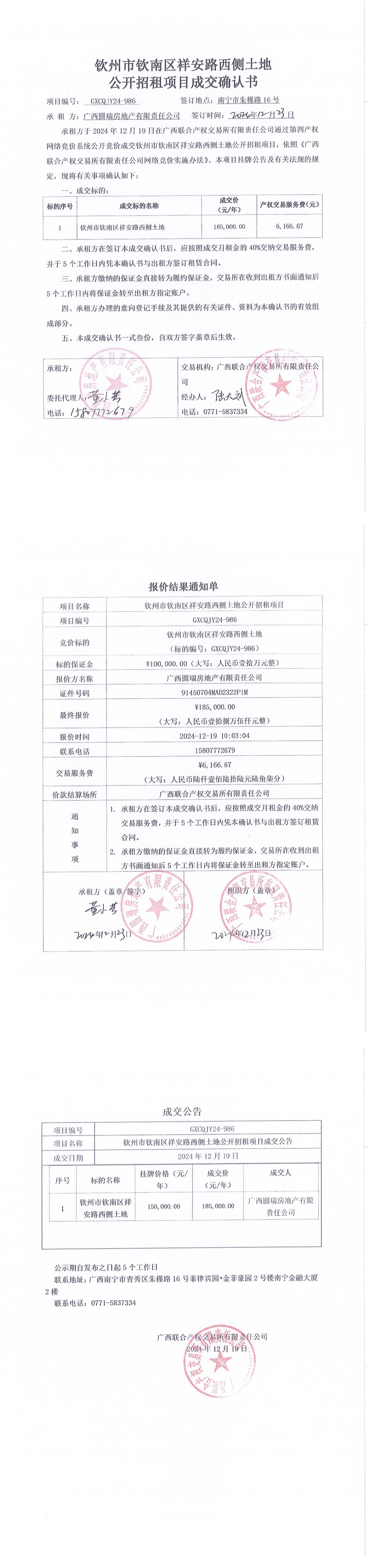 欽州市欽南區(qū)祥安路西側(cè)土地公開(kāi)招租項(xiàng)目成交確認(rèn)書