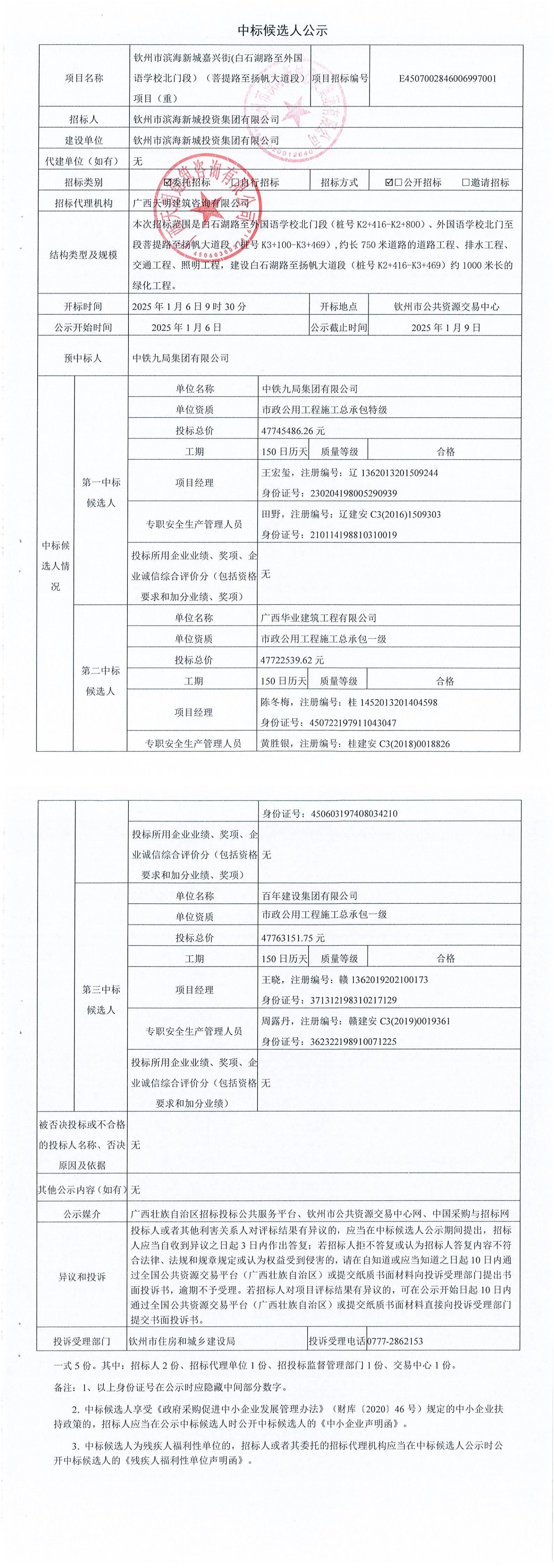 欽州市濱海新城嘉興街(白石湖路至外國(guó)語(yǔ)學(xué)校北門段)(菩提路至揚(yáng)帆大道段)項(xiàng)目(重)中標(biāo)候選人公示