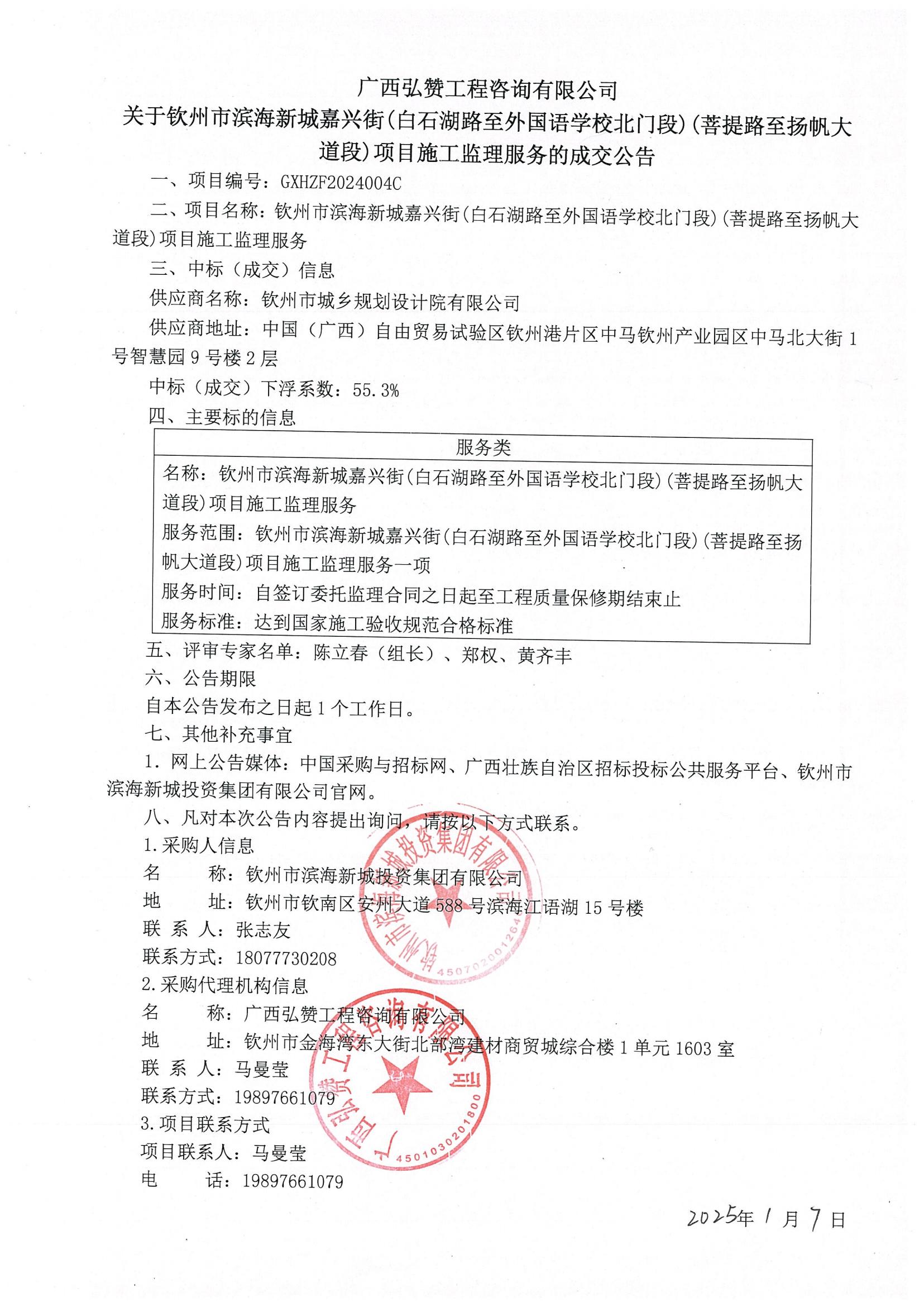廣西弘贊工程咨詢有限公司關(guān)于欽州市濱海新城嘉興街(白石湖路至外國(guó)語(yǔ)學(xué)校北門段)(菩提路至揚(yáng)帆大道段)項(xiàng)目施工監(jiān)理服務(wù)的成交公告