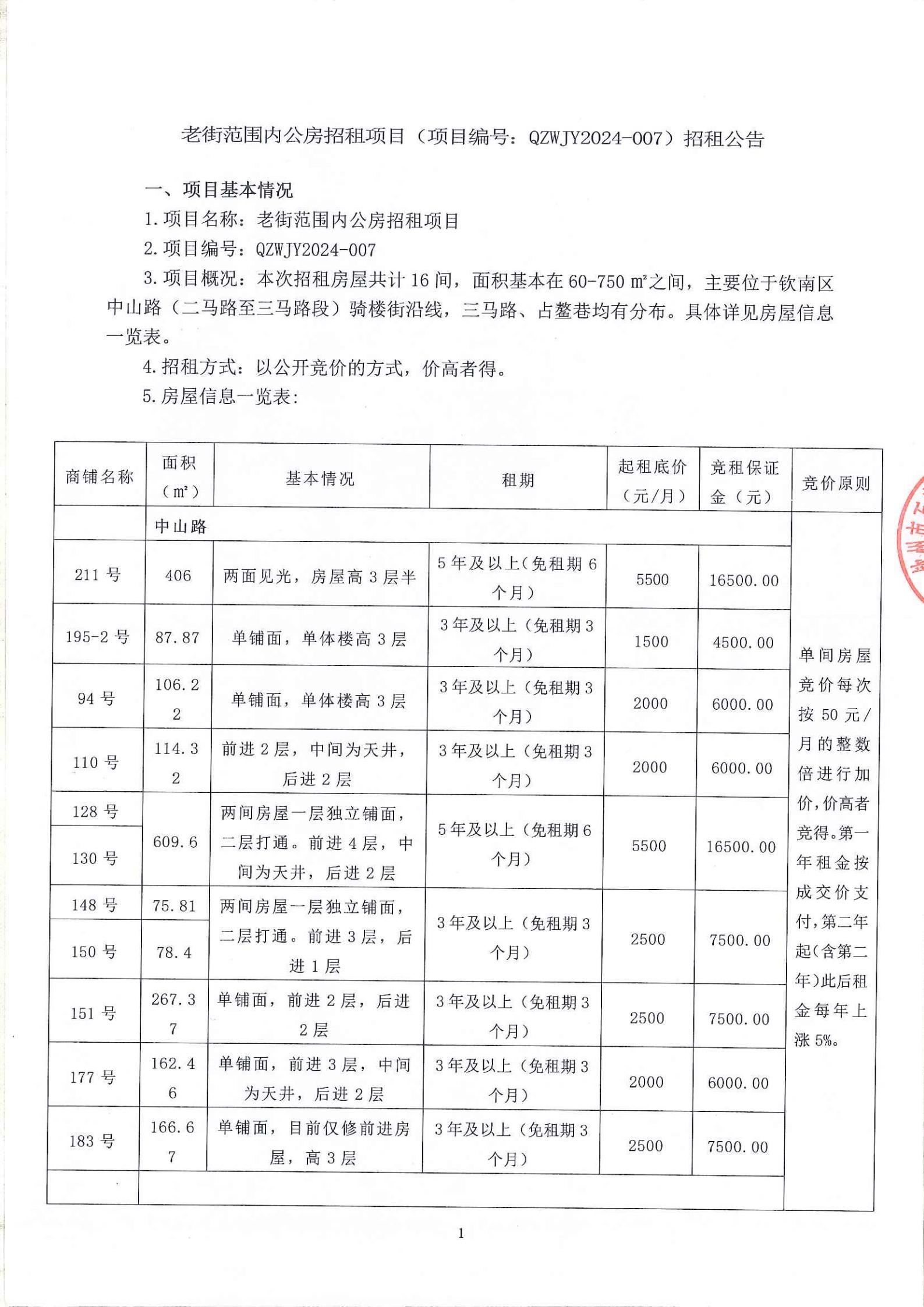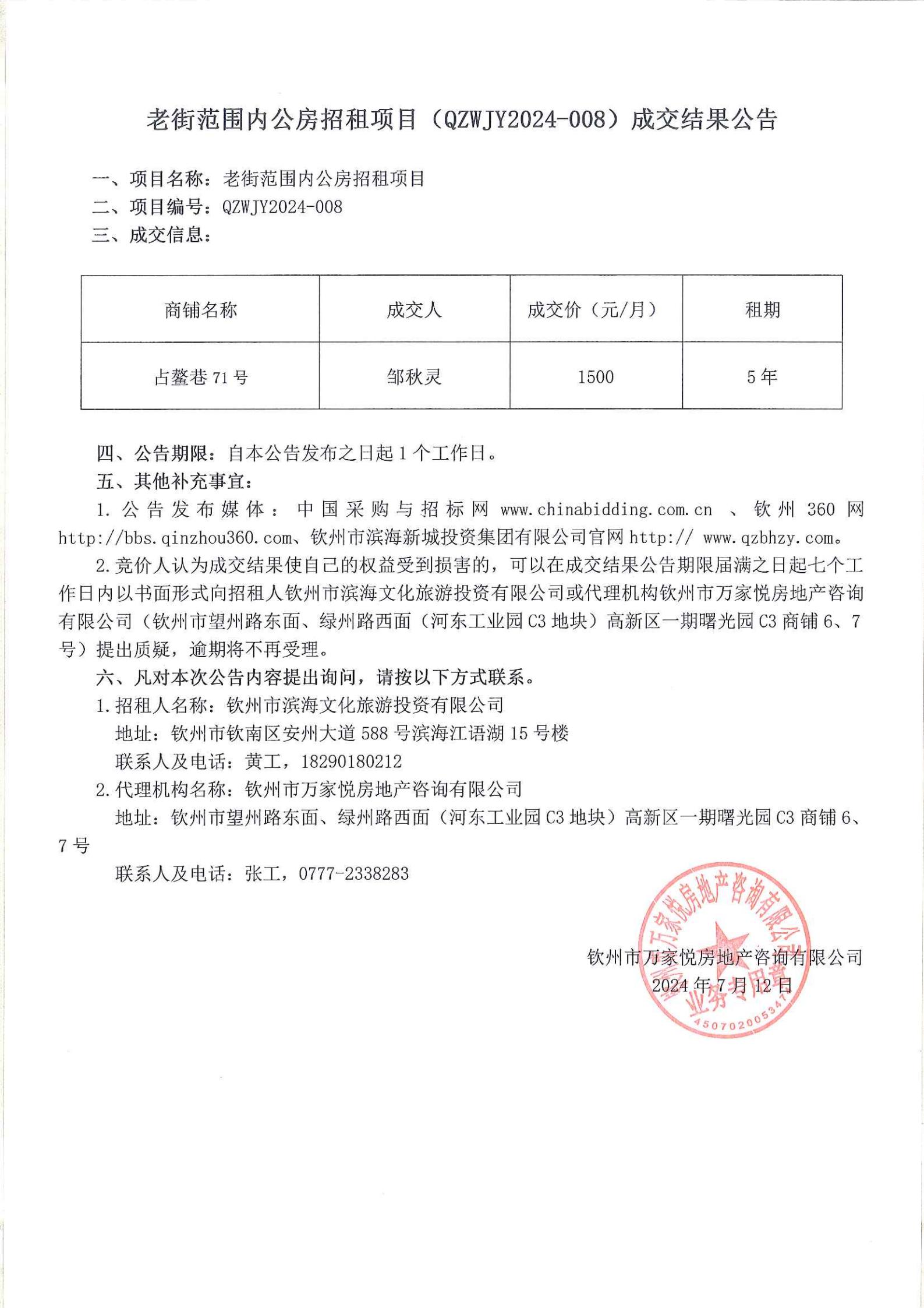 老街范圍內(nèi)公房招租項目(QZWJY2024-008)成交結(jié)果公告(占鰲巷71號)