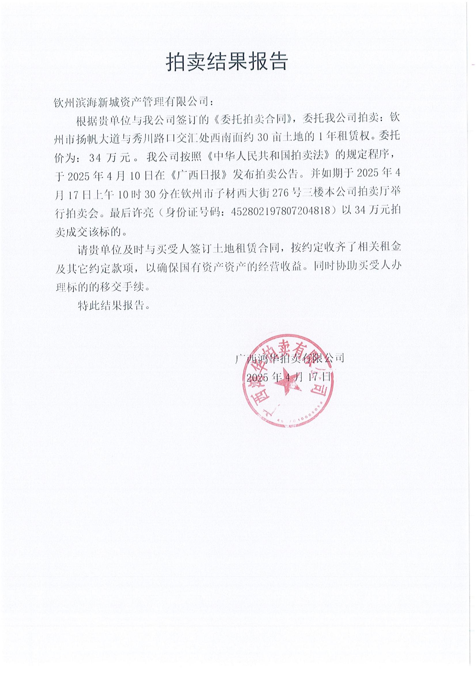 欽州市安州大道西側(cè)、嘉興街南北側(cè)約760㎡土地的5年租賃權(quán)拍賣文件