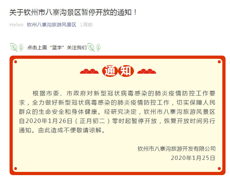 為進一步加強八寨溝景區(qū)新型冠狀病毒感染的肺炎疫情防控工作,有效防止疫情經(jīng)旅游途徑傳播,切實保障游客及公司員工身體健康和生命安全。根據(jù)欽州市委專題擴大會議對新型冠狀病毒感染肺炎疫情防控工作的部署,欽州市文化廣電體育和旅游局《關(guān)于取消欽州市 2020 年春節(jié)期間文化體育旅游活動和暫停相關(guān)文化體育旅游業(yè)務的通知》,以及欽州市文化廣電體育和旅游局《關(guān)于全市A級景區(qū)、鄉(xiāng)村旅游區(qū)、農(nóng)家樂暫停對外開放的通知》,...