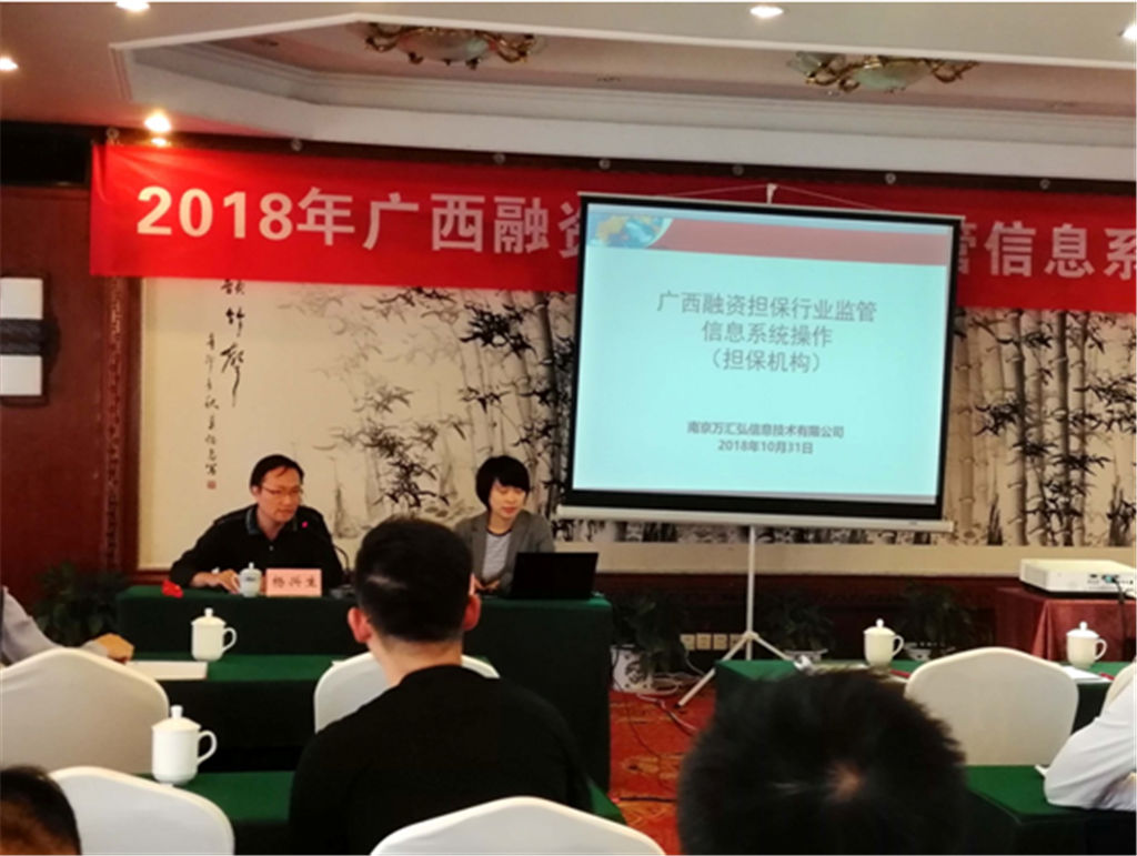 2018年10月31日,由自治區(qū)金融辦組織,在桂林榕湖飯店由系統(tǒng)設(shè)計(jì)方南京萬匯弘信息科技有限公司負(fù)責(zé)人陳月對廣西融資擔(dān)保行業(yè)監(jiān)管信息系統(tǒng)操作進(jìn)行培訓(xùn)。
