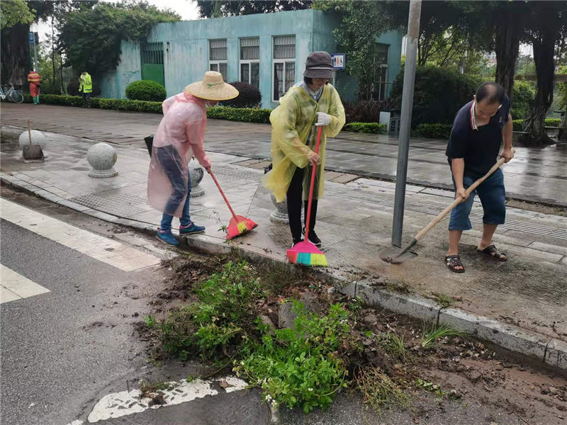 活動(dòng)當(dāng)天,煙雨朦朧。志愿者們有的拿著鏟子,有的拿著掃把,有的拿著垃圾簍,冒雨干起活來。