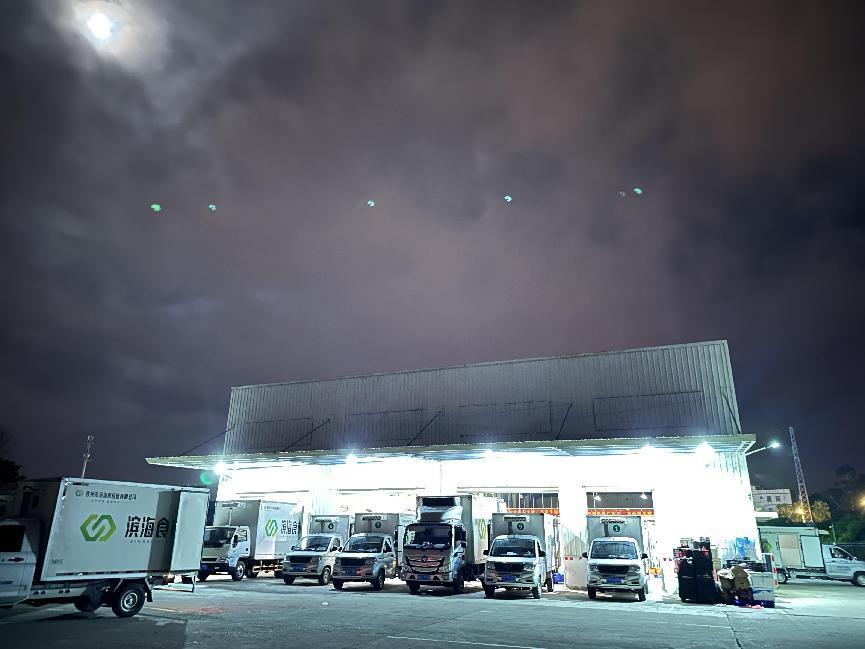 圖為凌晨?jī)牲c(diǎn),濱海食材公共配送中心的倉庫燈火通明,冷鏈車整裝待發(fā)