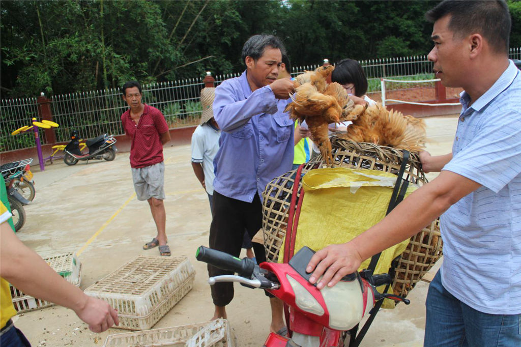 當(dāng)天上午,運(yùn)送雞苗的貨車從欽州市出發(fā),經(jīng)過(guò)1個(gè)小時(shí)的行程來(lái)到了靈山縣伯勞鎮(zhèn)新禾村公共服務(wù)中心,此時(shí),貧困戶們已經(jīng)滿心歡喜地到來(lái),攜帶裝雞苗的籠子耐心等候著。現(xiàn)場(chǎng),集團(tuán)公司副總經(jīng)理?xiàng)钚聴澰诠ぷ魅藛T的協(xié)助下,依次給貧困戶們發(fā)放了雞苗,楊新棟笑著對(duì)貧困戶說(shuō)到:“大家領(lǐng)取到的雞苗平均每只重600克左右,雞苗在運(yùn)出養(yǎng)殖場(chǎng)之前都已閹割過(guò)了,具有生長(zhǎng)發(fā)育快、抗病能力強(qiáng)、成活率高、市場(chǎng)效益好等特點(diǎn),大家回去后要管護(hù)好雞苗,讓扶貧雞真正為大家?guī)?lái)脫貧希望。”,看著一只只活潑亂跳、帶著脫貧希望的雞苗裝進(jìn)了自家的籠子里,貧困戶們笑得合不攏嘴,心里樂(lè)開(kāi)了花。