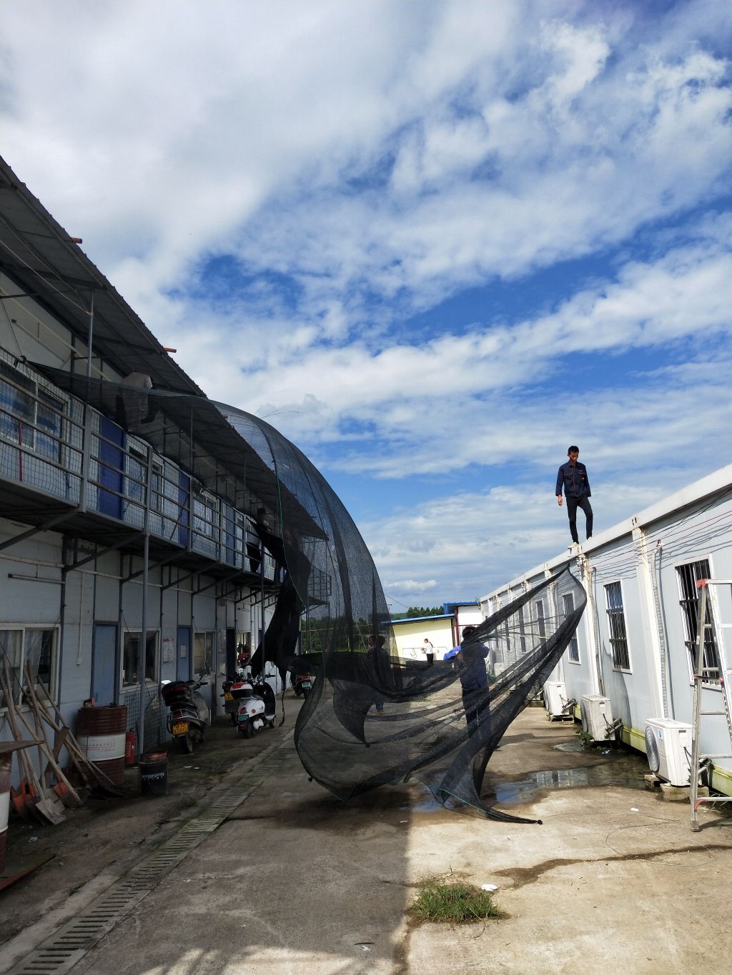 會議反復向工人強調了安全的重要性并提出了以下幾點要求,一是要求工人密切關注臺風動向,雷雨大風天氣可轉移至一樓會議室休息;二是要求保障用電安全,做好各配電箱的防雨措施和架空線路的防風措施,在臺風暴雨天氣應停止供電,尤其要關閉監(jiān)控攝像頭及地磅傳感器,避免雷擊損壞;三是要求對空調外掛機、瀝青攪拌設備、圍墻、行道樹等易倒伏物進行加固或拆除,減少財產(chǎn)損失;四是要求加強生產(chǎn)生活設施和排水設施檢查,對工人宿舍、辦公室等臨時設施進行全面安全檢查,發(fā)現(xiàn)安全隱患,立即整改;五是要求臺風暴雨過后要對所有用電設施和線路,生產(chǎn)和生活場地與設施的安全情況進行全面排查,消除臺風暴雨帶來的安全隱患。