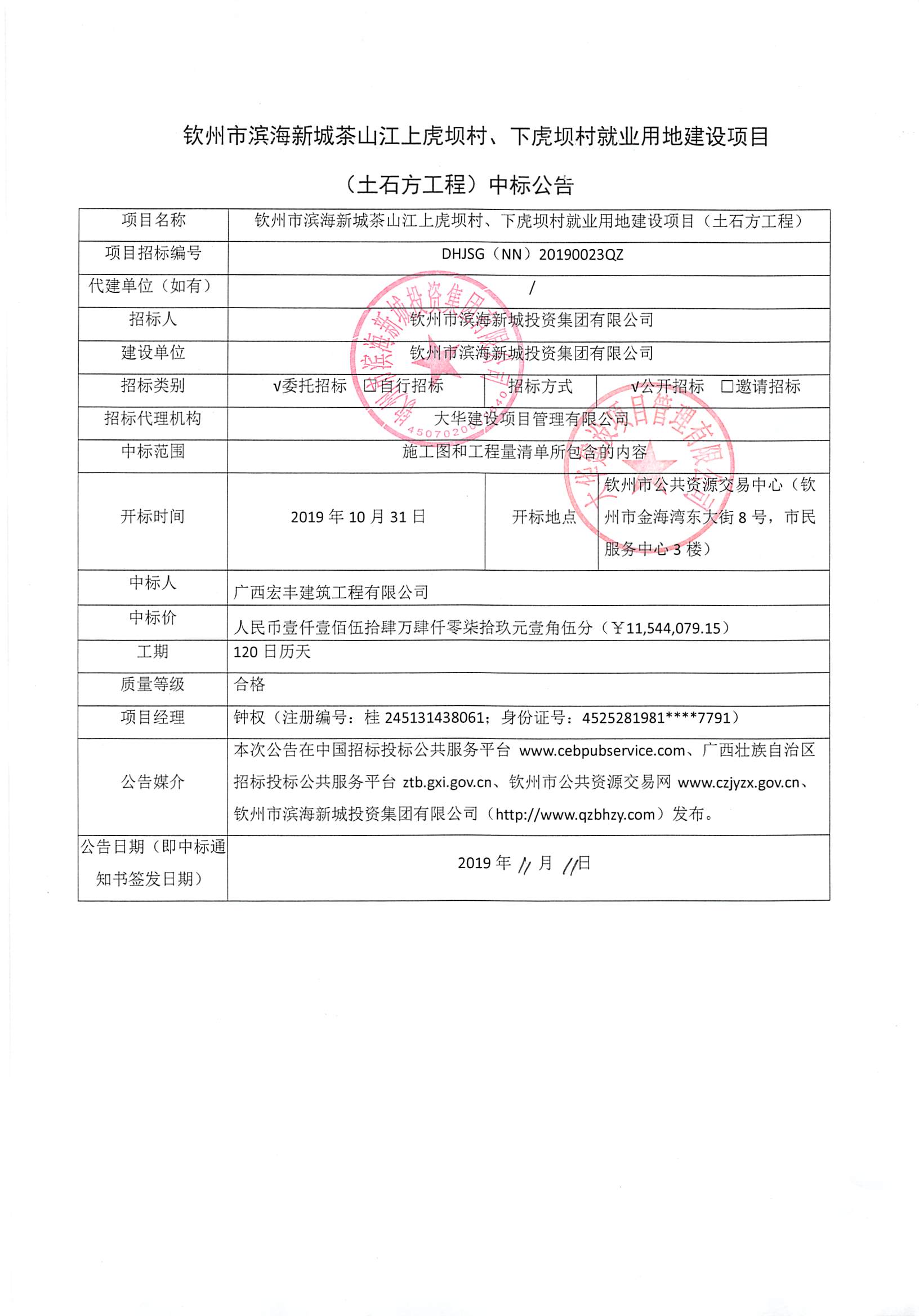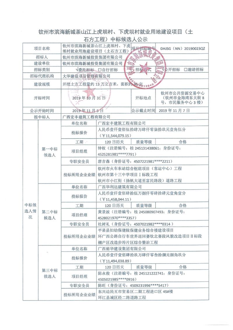 欽州市濱海新城茶山江上虎壩村、下虎壩村就業(yè)用地建設(shè)項(xiàng)目(土石方工程)中標(biāo)公示