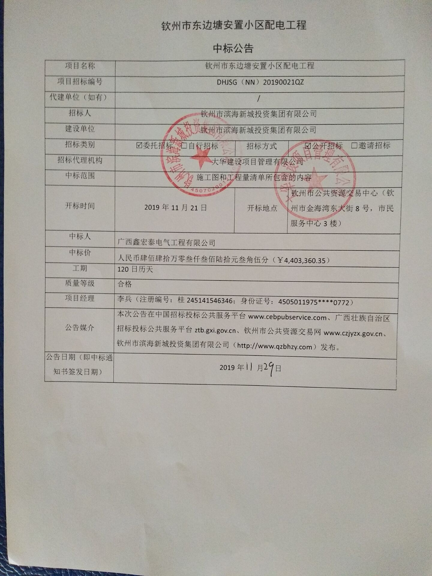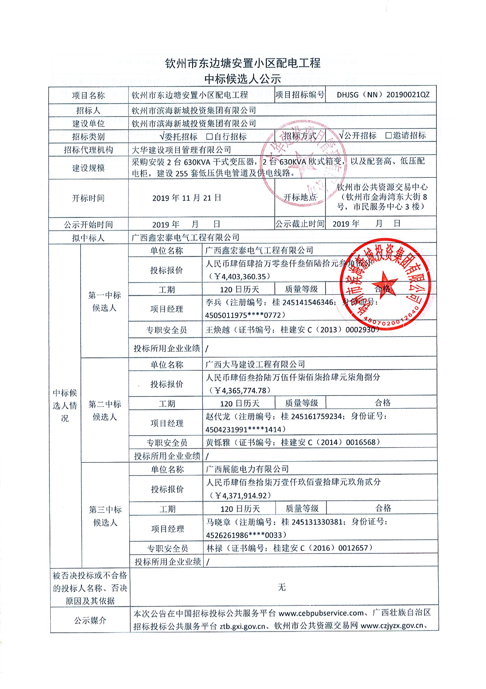欽州市東邊塘安置小區(qū)配電工程中標(biāo)候選人公示