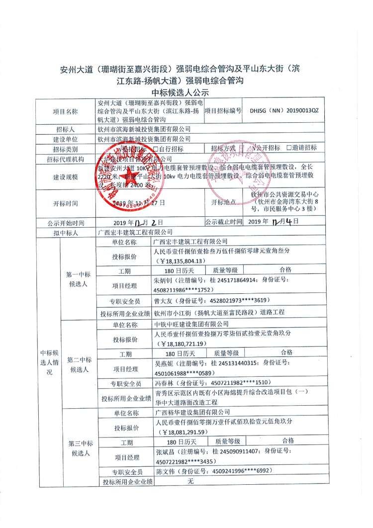 欽州市濱海新城嘉興街(嘉禾街-揚(yáng)帆大道)道路工程及嘉興街(揚(yáng)帆大道-安州大道)地下綜合管廊項(xiàng)目、欽州市公安局沙埠派出所項(xiàng)目、欽州市濱海新城安州大道中段與環(huán)城南路交叉路口工程綜合檢測(cè)中標(biāo)候選人公示