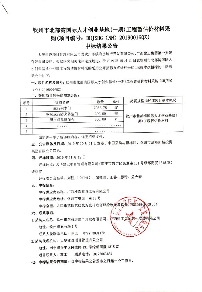 欽州市北部灣國(guó)際人才創(chuàng)業(yè)基地(一期)工程暫估價(jià)材料采購(gòu)-中標(biāo)結(jié)果公告