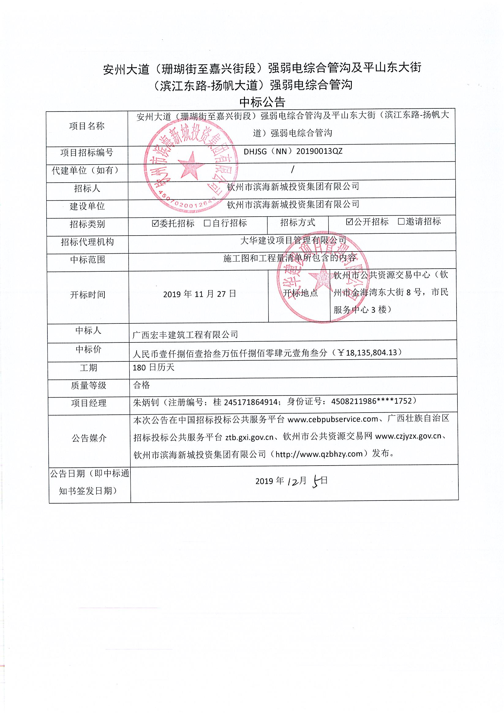 安州大道(珊瑚街至嘉興街段)強(qiáng)弱電綜合管溝及平山東大街(濱江東路-揚(yáng)帆大道)強(qiáng)弱電綜合管溝-中標(biāo)公告