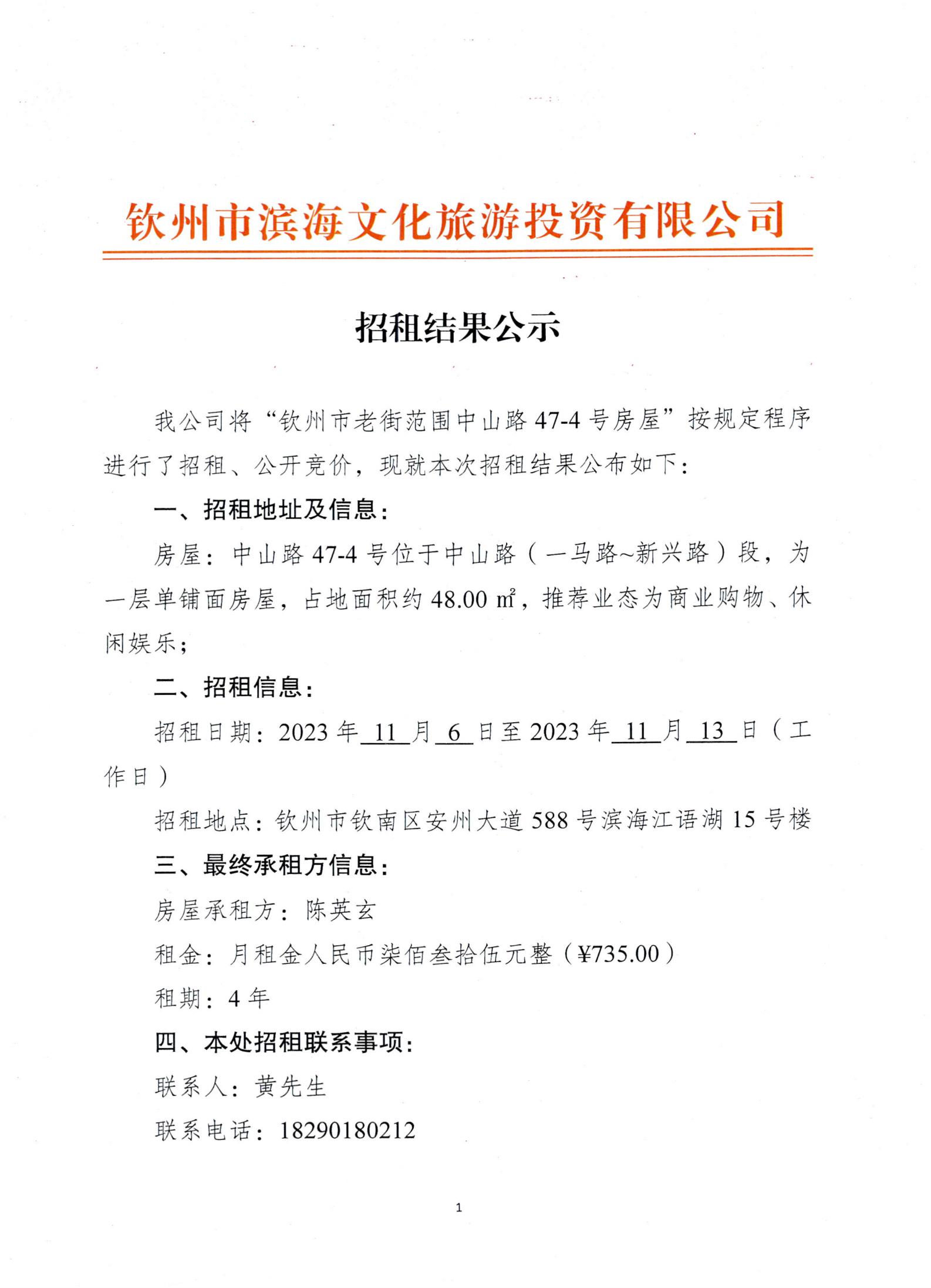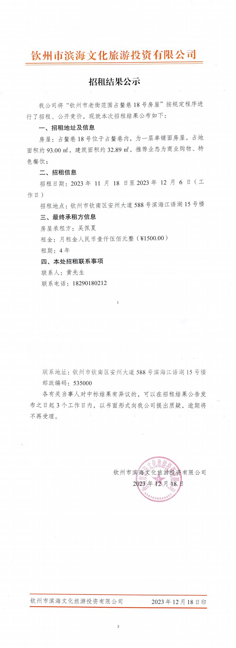 欽州市老街范圍占鰲巷67、71號兩處房屋公開招租結(jié)果公示