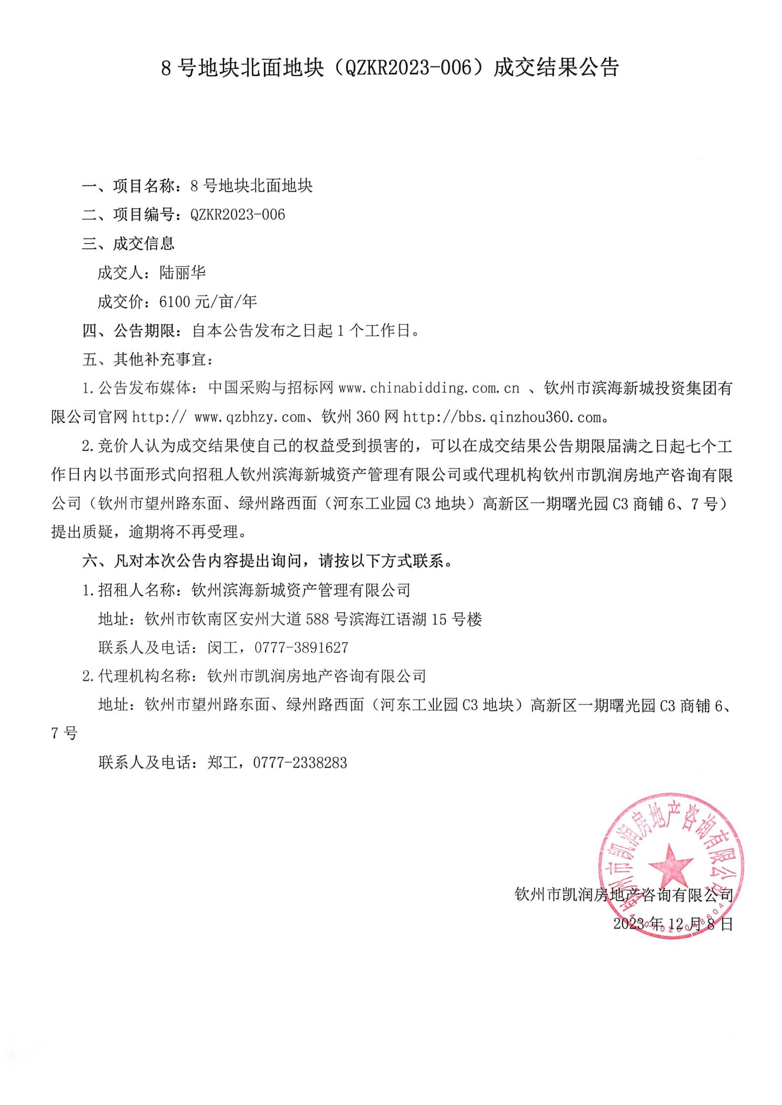 8號(hào)地塊北面地塊(QZKR2023-006)成交結(jié)果公告