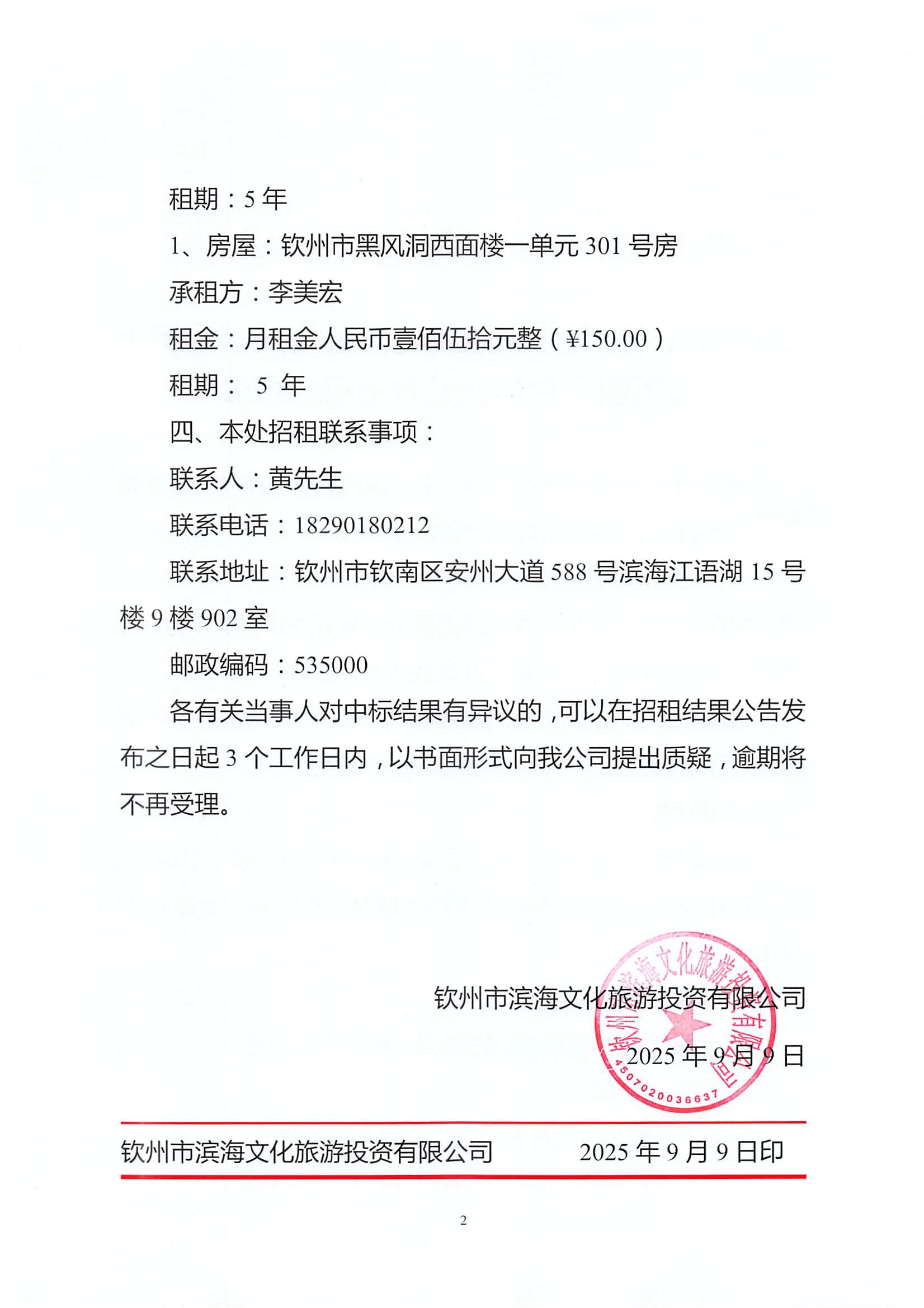 欽州市濱海文化旅游投資有限公司關(guān)于欽州市老街范圍2處房屋公開(kāi)招租結(jié)果公示