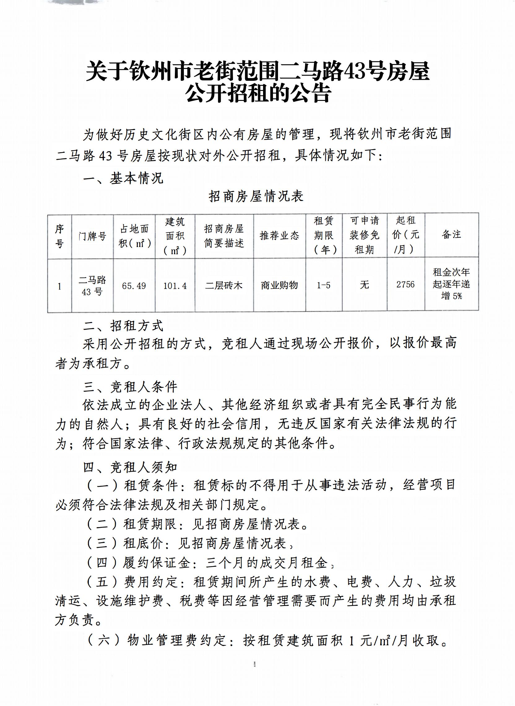 欽州市老街范圍二馬路43號(hào)房屋公開招租